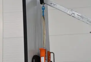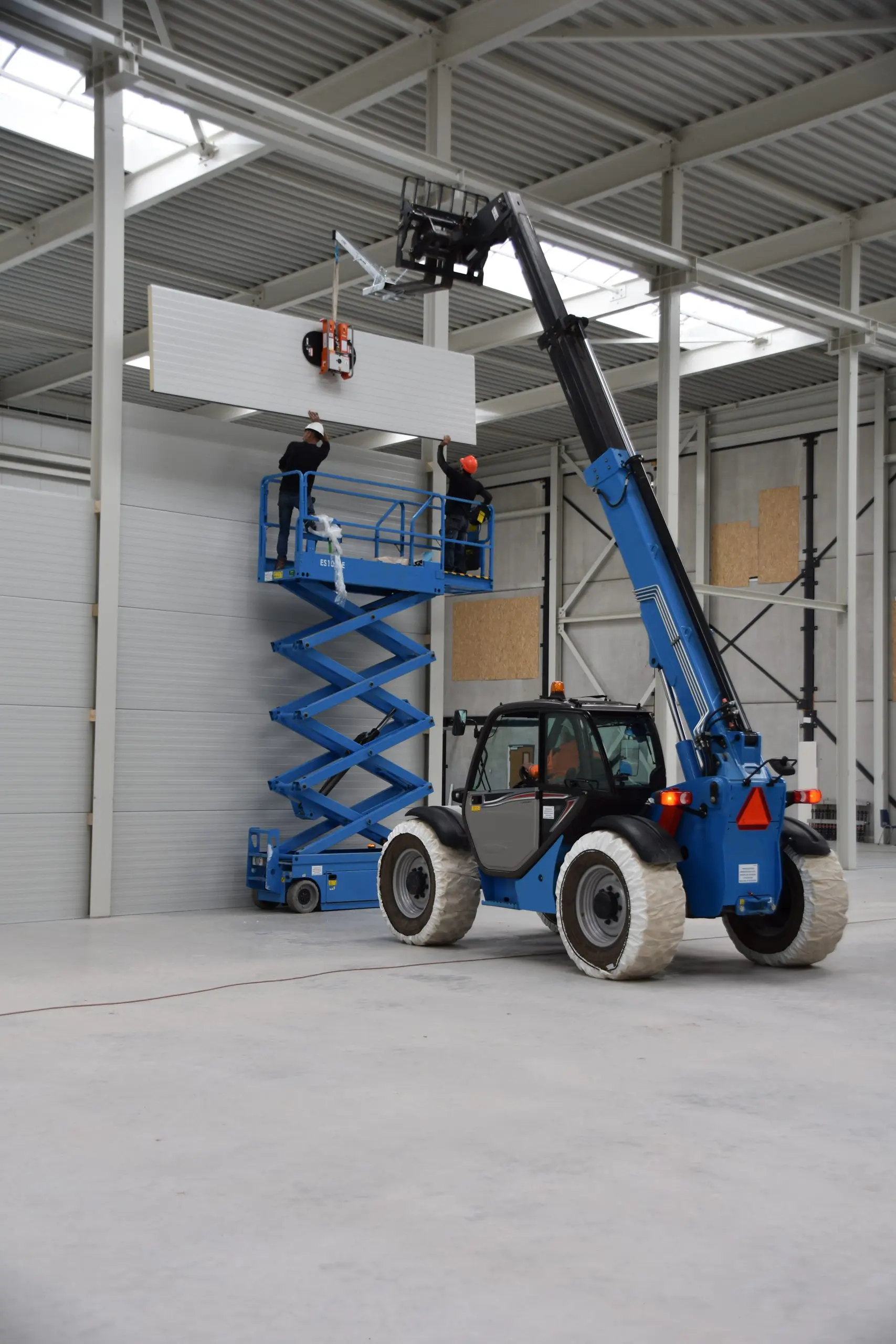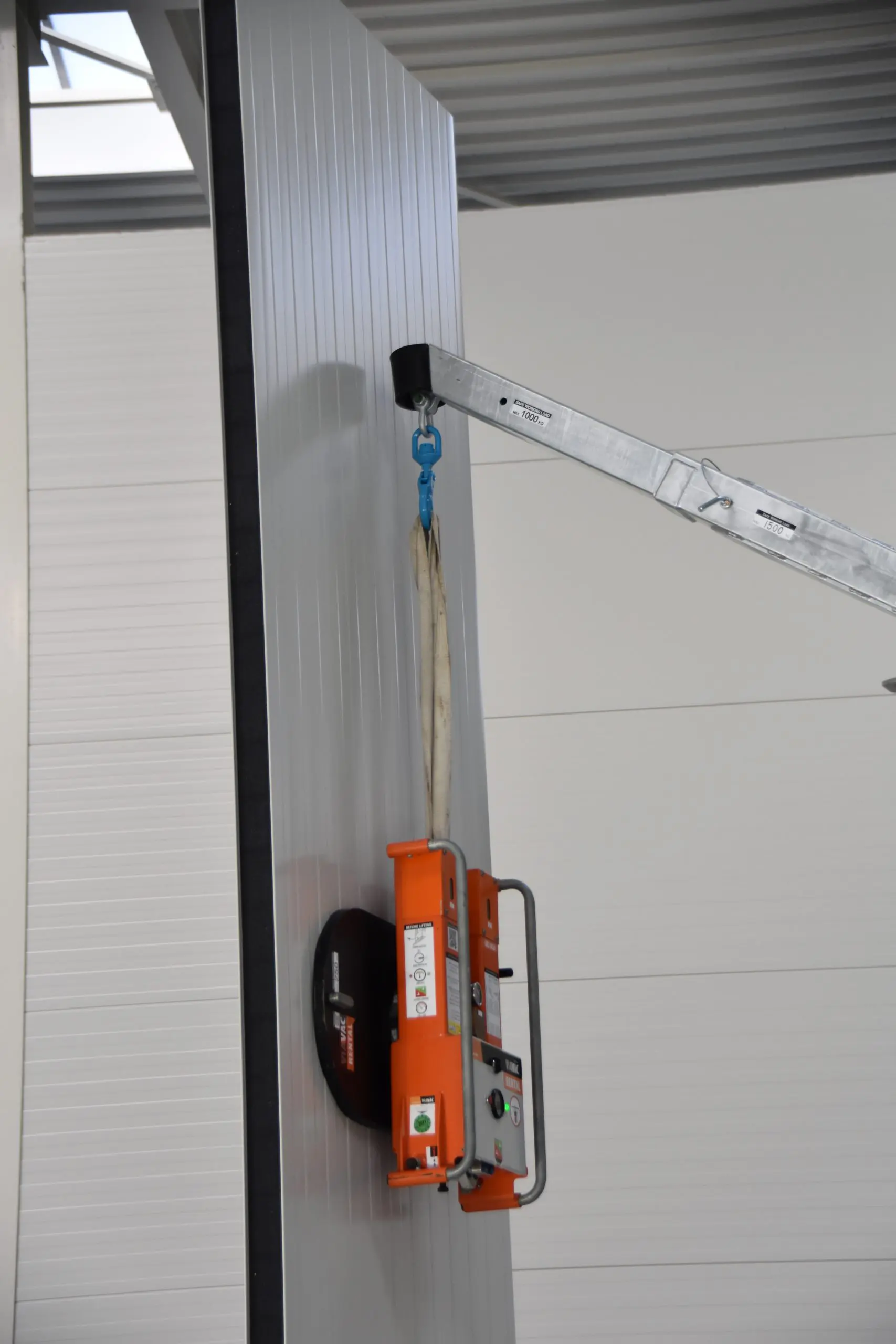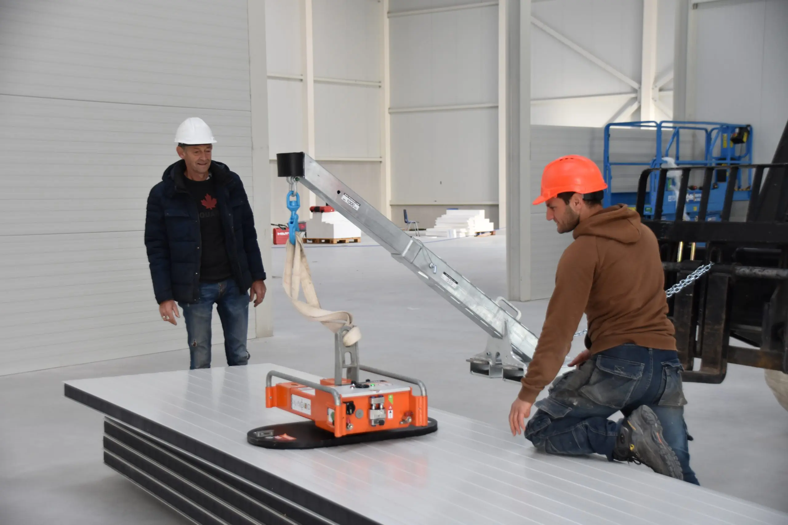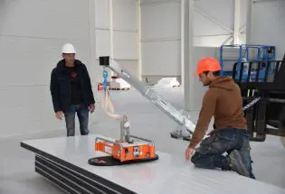 CladBoy kompaktın, üzerine VIAVAC CraneArm monte edilmiş bir forklift ile birlikte kullanılması ağır panellerin montajını basit ve kolay hale getirir.